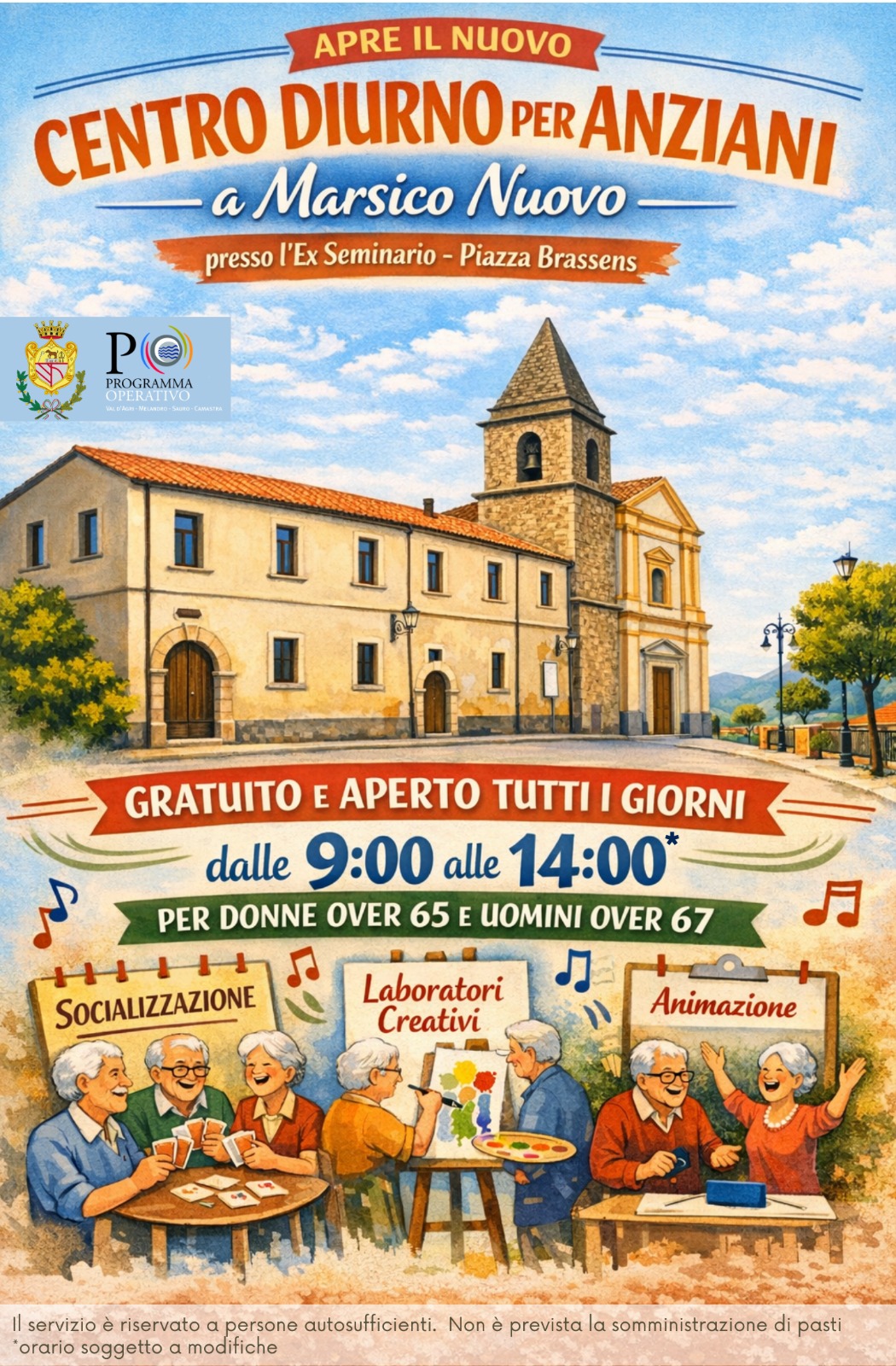 Testo completo title COMUNE DI MARSICO NUOVO Provincia di Potenza Nuovo Centro Diurno per Anziani – aperte le pre-iscrizioni Sono aperte le pre-iscrizioni al Centro Diurno per Anziani. Come iscriversi: Compilare il modulo disponibile: presso gli uffici del comune di Marsico Nuovo sul sito istituzionale dell’ente Consegnare il modulo: a mano presso il comune oppure tramite pec all’indirizzo: comune.marsiconuovo@cert.ruparbasilicata.it Requisiti: Donne over 65 Uomini over 67 Persone autosufficienti Per ulteriori informazioni è possibile contattare gli uffici comunali.